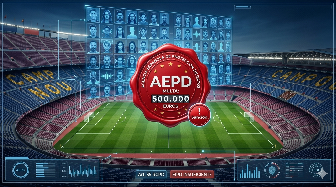 La Agencia Española de Protección de Datos ha sancionado al Fútbol Club Barcelona en la resolución sancionadora del expediente EXP202305134, documento PS-00450-2024, con una multa de 500.000 euros por infracción del artículo 35 del RGPD, al considerar insuficiente la evaluación de impacto relativa al tratamiento biométrico desplegado en la campaña de actualización del censo de socios. La resolución archiva, en cambio, la imputación relativa al artículo 9 del RGPD, de modo que el reproche definitivo se centra en la falta de una EIPD válida y completa para un tratamiento que la propia Agencia califica de alto riesgo.